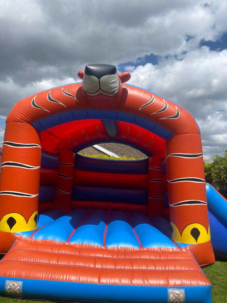 We have smaller themed castles with slides, choose from clown or jungle theme. We also have a larger tiger slide castle at 24 ft x 17 ft. Perfect for any kids party.
